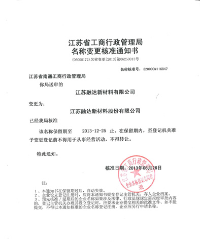 為推動可持續(xù)發(fā)展,為公司邁入資本市場做準備,公司全體股東投票決定同意將江蘇融達新材料有限公司更名為江蘇融達新材料股份有限公司,并提交江蘇省工商行政管理局審批通過。