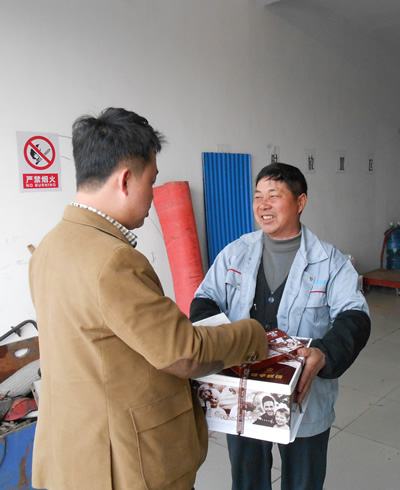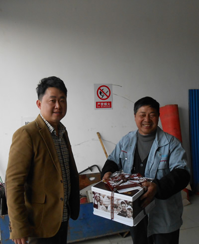 2014年3月18日下午,總經(jīng)理?xiàng)盍链砉緦⑸盏案夂蜏剀白8K偷搅水?dāng)天過生日的員工衛(wèi)金泉和張錦山的手上。對于這突如其來的喜悅,他們非常激動,同時表達(dá)了對公司的謝意,并表示會繼續(xù)努力工作,回報公司的關(guān)愛。張錦山當(dāng)時甚至有些“懵了”,在了解了公司領(lǐng)導(dǎo)的來意后,說出了最樸實(shí)的4個字:謝謝老板!